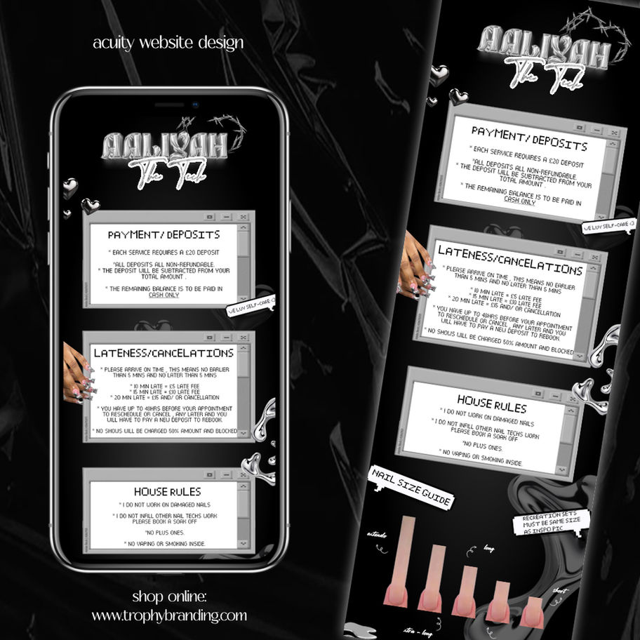 Custom acuity designs are taking over the beauty industy. Match the quality of your content and service to your booking site ! The design of your booking website can increase customer interactions , client engagement and drive sales.